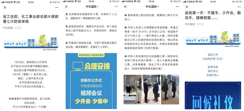 1月23日,化工事业部下发《关于切实做好新冠肺炎疫情防控工作的紧急通知》,提供四项具体工作措施,坚决遏制疫情扩散。